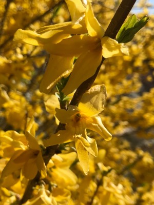 その中にところどころ差し色のようにある黄色の花は【レンギョウ】です。