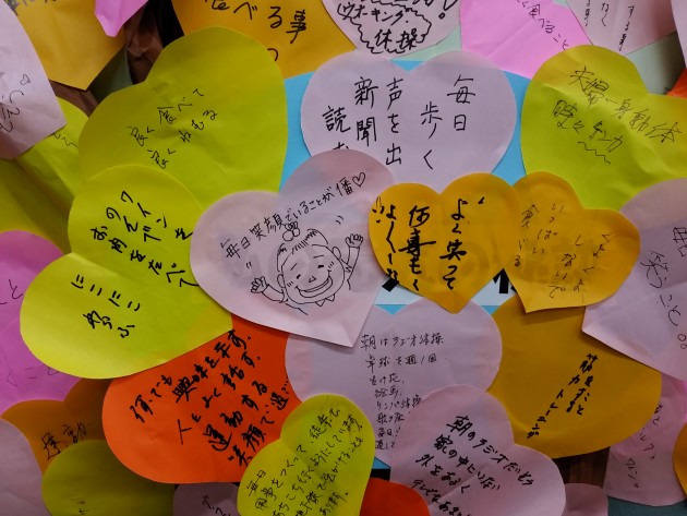 皆さんの元気の秘訣を書いていただいて、「げんきの木」に花を咲かせていました。