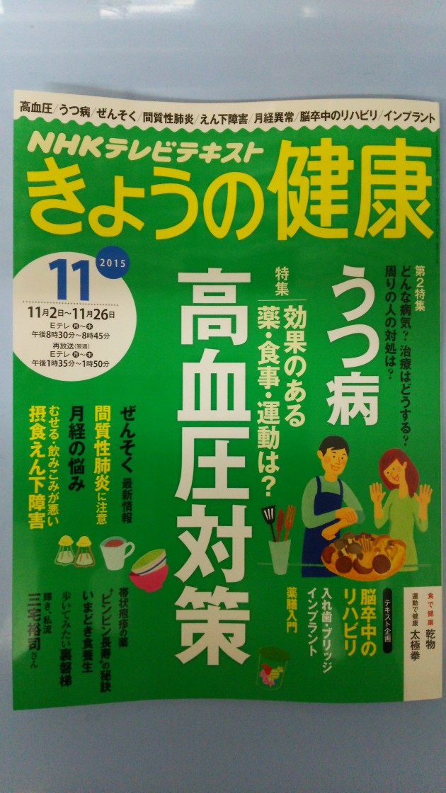 寒い日が続きますね。『きょうの健康』の11月号が届きました。今回は高血圧対策です。わかりやすくて面白いので、ぜひ読んでみてください♪NHKで毎週月曜日~木曜日PM8:30~8:45に放送中!!さとこまき調剤薬局営業時間月|火|水|金 09:00 〜 19:00 木 09:00 〜 12:00 土 09:00 〜 13:00 Y