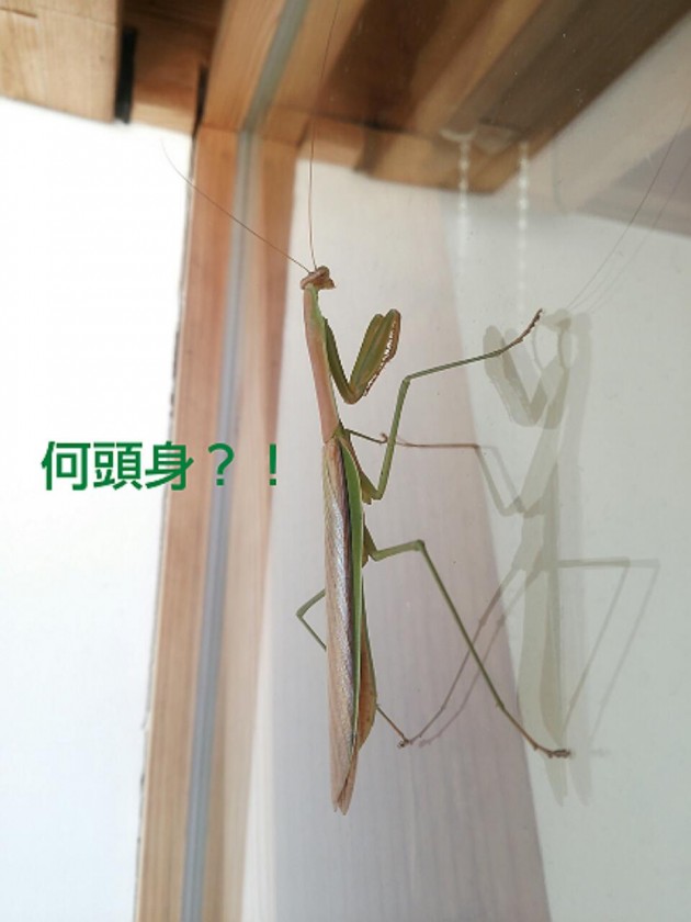 朝、薬局を開けると入口扉にカマキリが・・・。