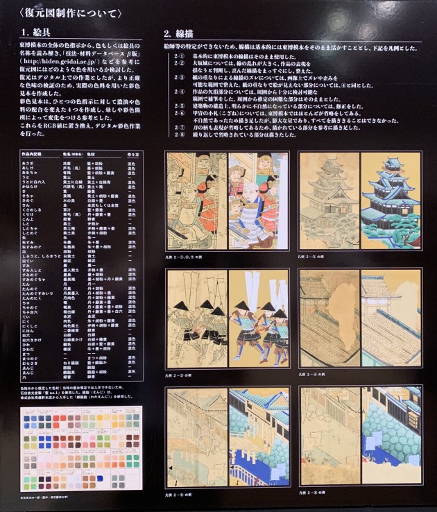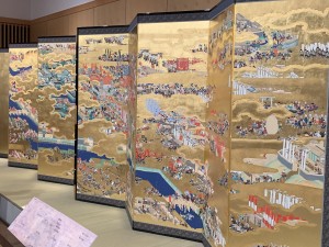 復元された「大坂冬の陣図屛風」は、左右一対の六つ折りの屛風。二つ並べた際の絵の部分は横約6メートル、縦約1.7メートルになる。1614年に徳川幕府と豊臣家が戦った「冬の陣」の陣立てや戦場の様子が詳しく描かれ、豊臣秀頼や真田幸村らとみられる姿もあります。息を吞む美しさと躍動感を感じてきました。