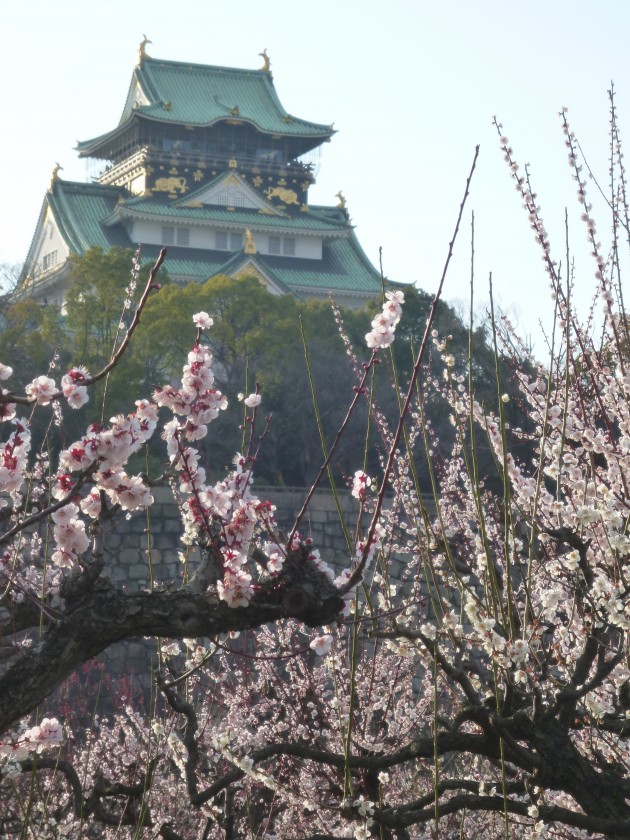 大阪城をバックに咲き誇る梅は