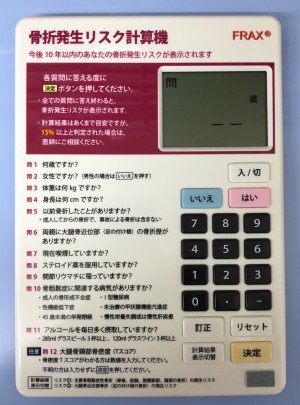 先日新聞の記事に出ていました。世界保健機関(WHO)が開発したFRAX。簡単なアンケート方式で今後10年間に骨折する確率を割り出す機器が紹介されていました。関心を持たれた方はおたずねください。
