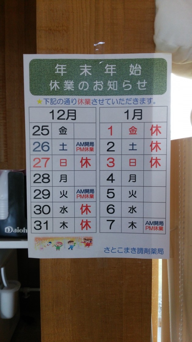 12月29日(火)午後から1月3日(日)まで休業させて頂きます。ご迷惑をおかけしますが、よろしくお願い致します。さとこまき調剤薬局営業時間月|火|水|金 09:00 〜 19:00 木 09:00 〜 12:00 土 09:00 〜 13:00 Y