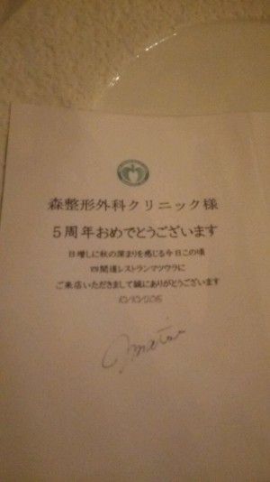 10月10日、森整形外科の五周年記念パーティーに、スタッフ全員で、行ってきました。松浦シェフの作る、すばらしいお料理をいただきました。クリニックとともに、当薬局も、丸五年を迎えます。これからも地域のために、頑張っていきたいな~と思っています。美味しかったな~♡♡♡