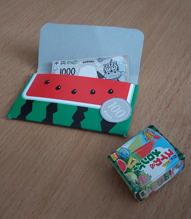 スイカの皮財布と、スイカバーのミニチュア箱(縦3cmくらい)が完成。